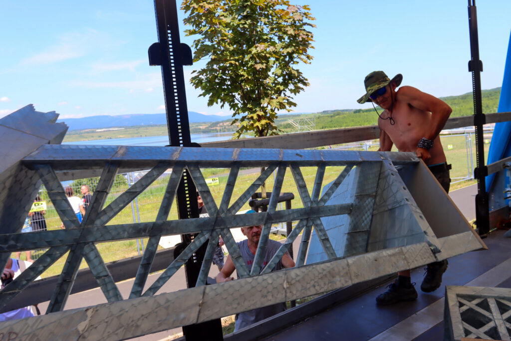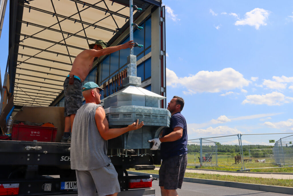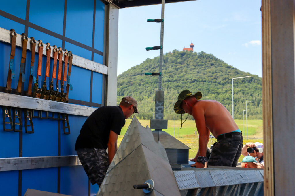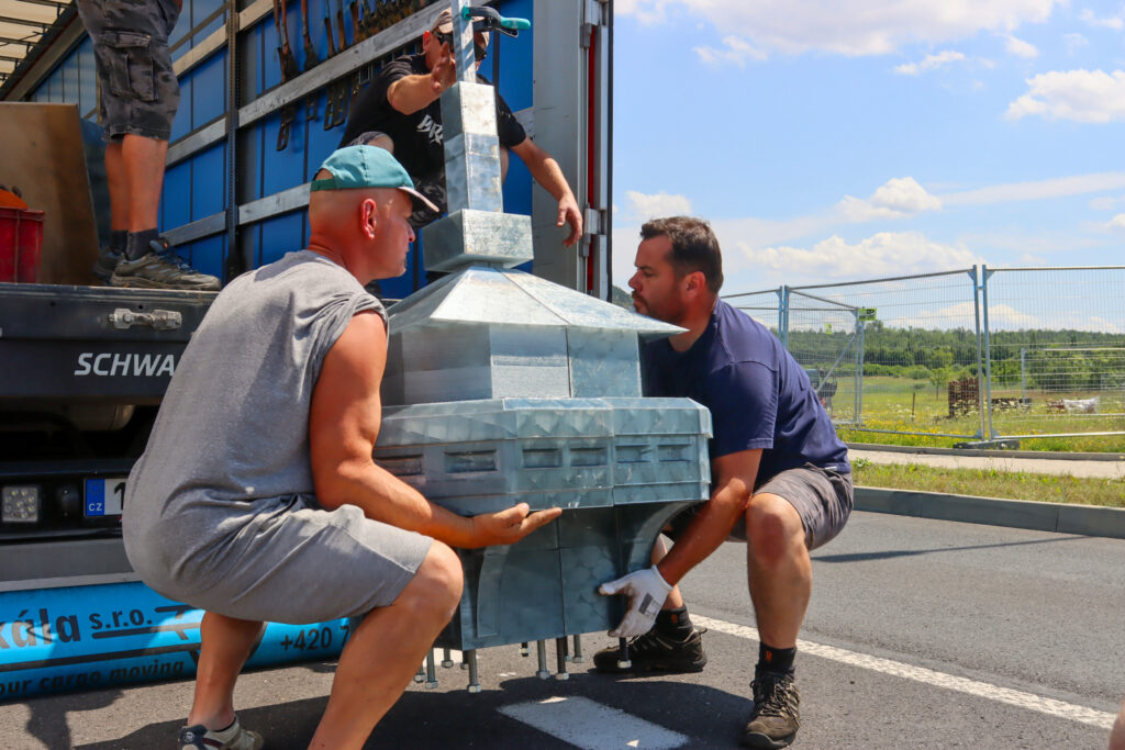 Dělníci s kusem věže. Foto: Filip Lipiner, redakce