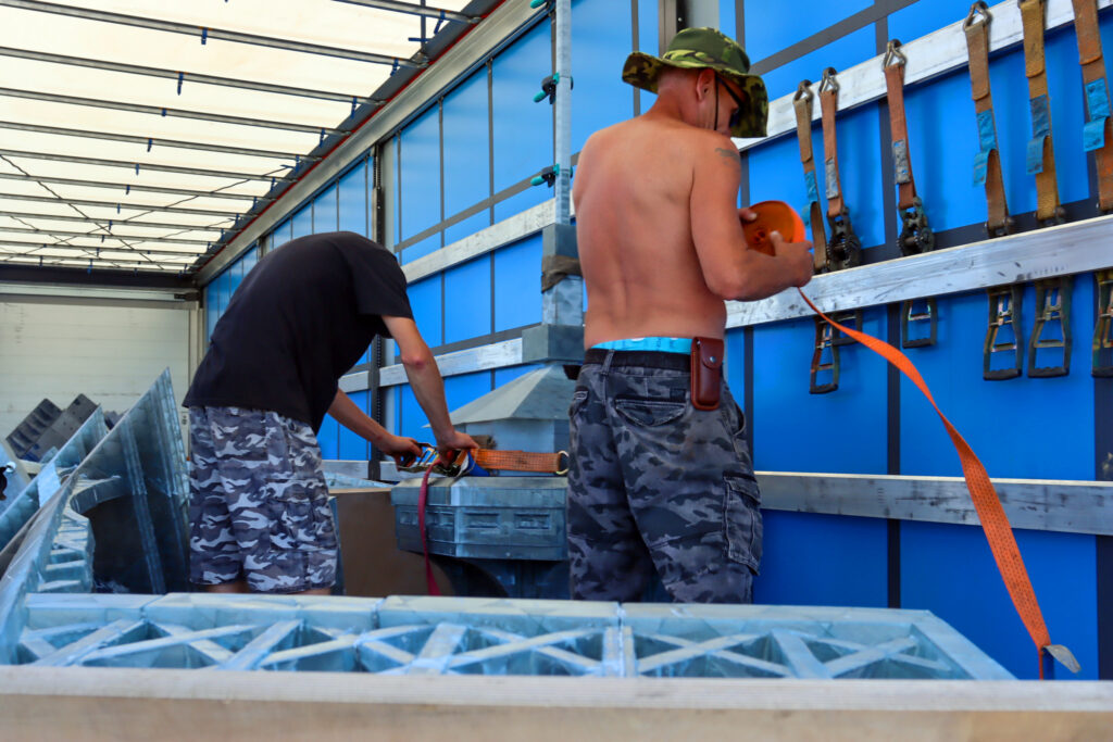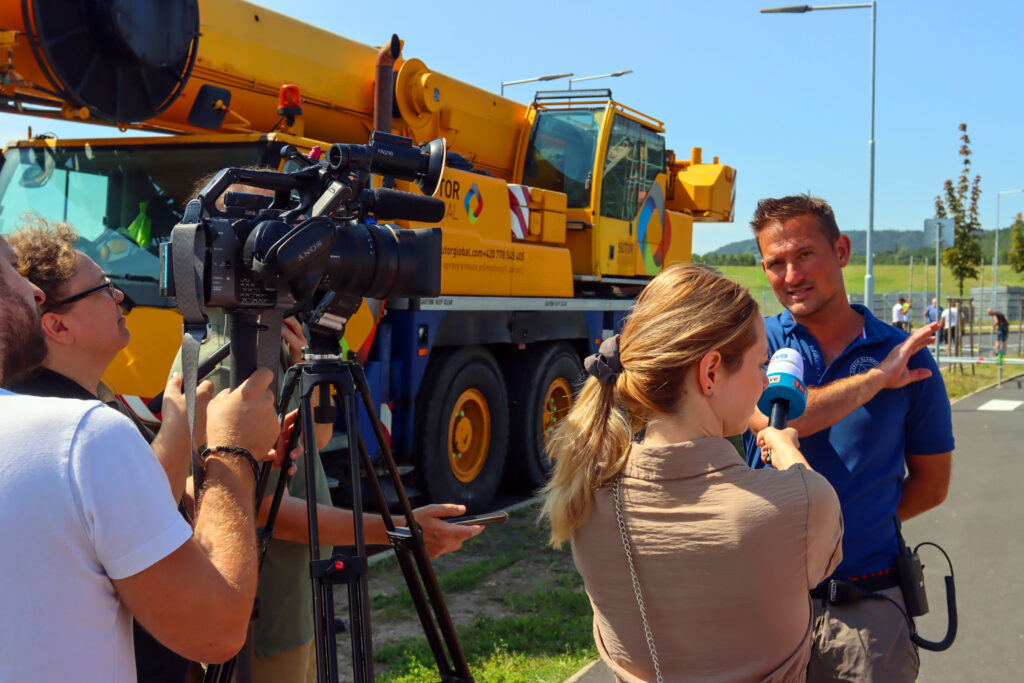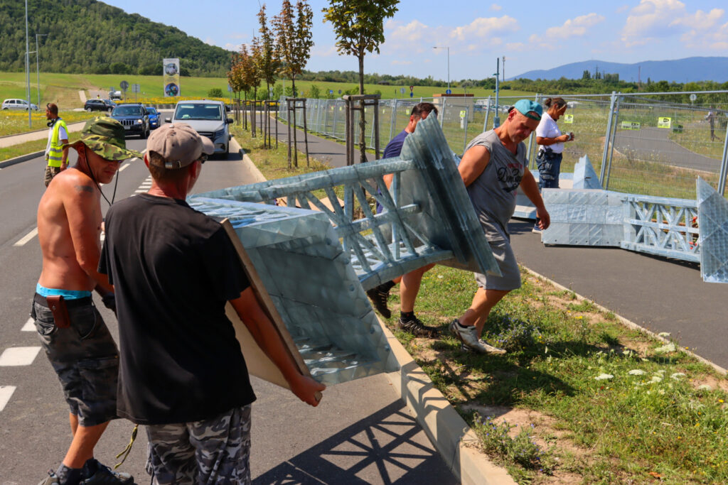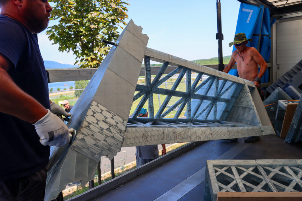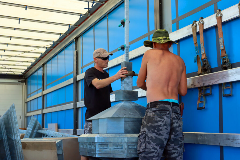 Dělníci s kusem věže. Foto: Filip Lipiner, redakce