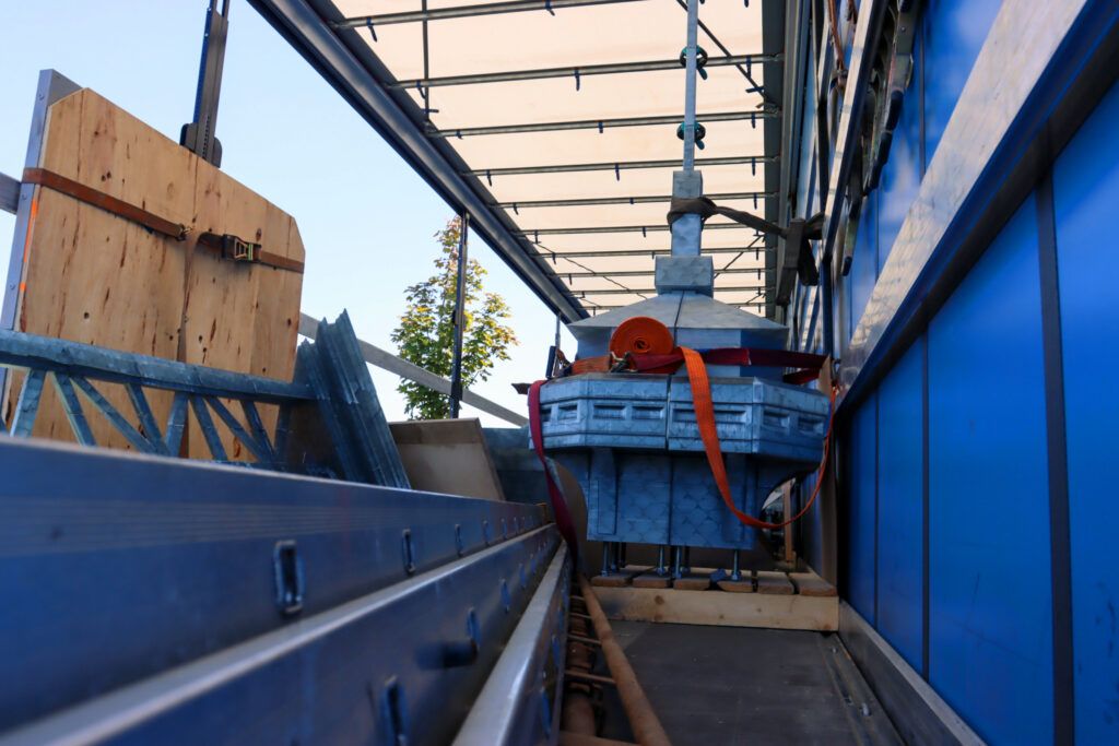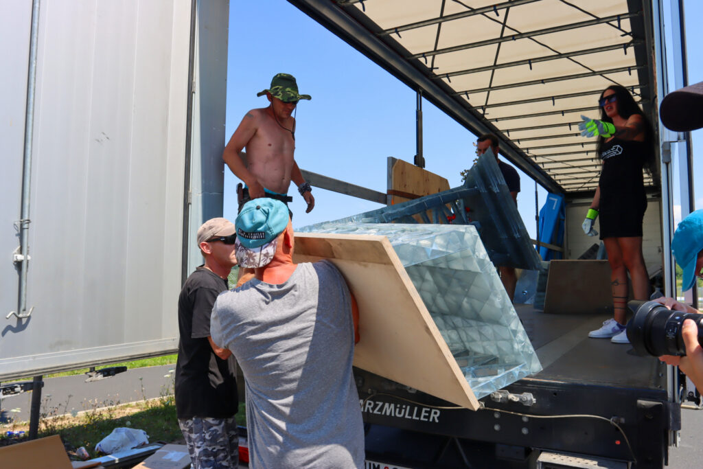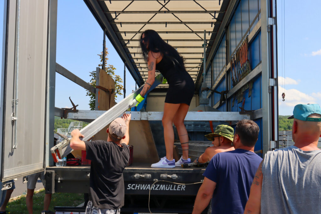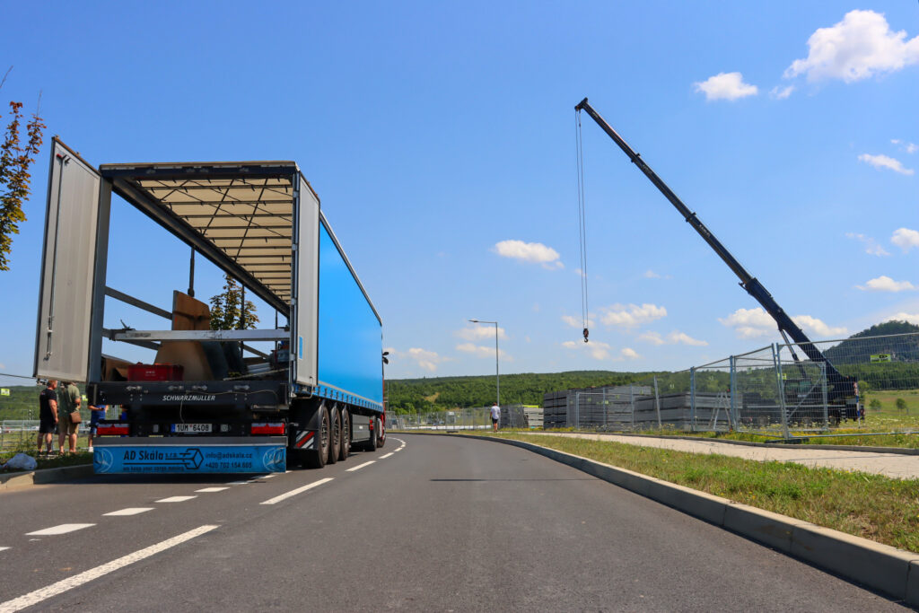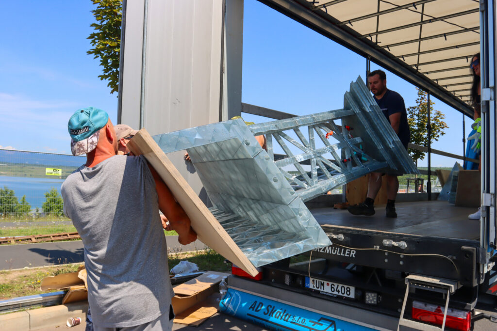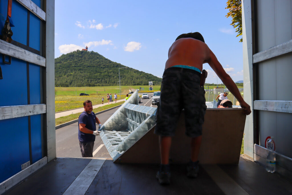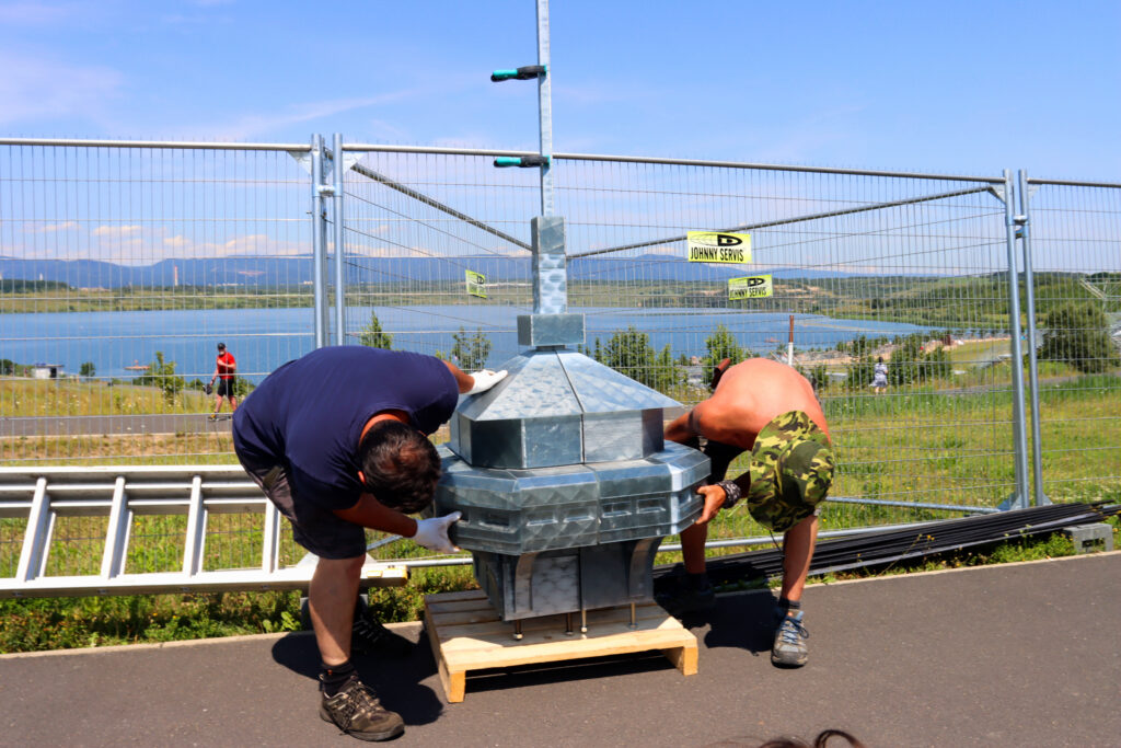 Dnes po poledni dorazil první ze dvou kamionů, který převážel kopii Eiffelovy věže k jezeru Most. Tato kopie byla již předem složena a bude u jezera finálně dokončena během pěti dnů.