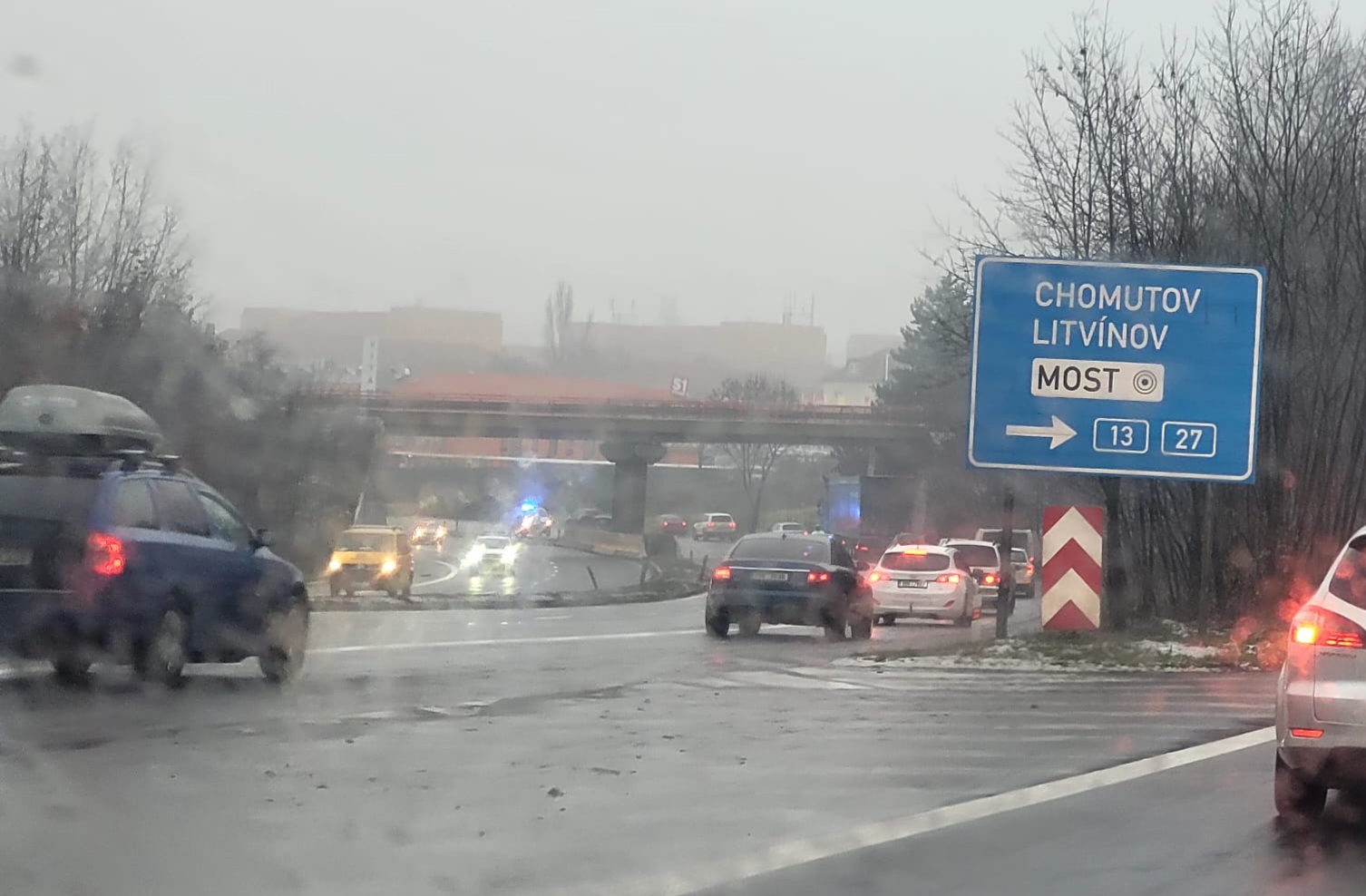 Již přes hodinu komplikuje dopravu nehoda dvou osobních vozidel na silnici I/13 za prvním sjezdem na Most. Nehoda je naštěstí bez zranění. Jezdí se jedním pruhem, proto se tvoří menší kolony. Projíždějte s opatrností. Na místě jsou dopravní policisté. Foto: Čtenář.