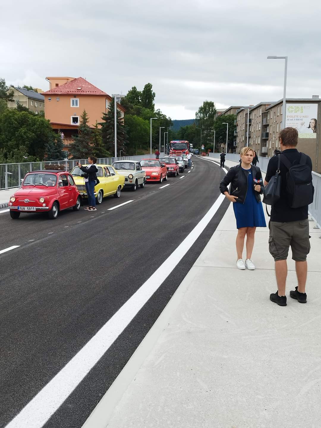 Právě teď je v litvínovské ulici Podkrušnohorská živo. Koná se tu totiž slavnostní otevření nově postaveného mostu, který byl před pár dny dokončen. Slavnostně tu tak po mostě projíždí veteráni, hasiči i policisté. Na místě je také televize. Slavnostní přestřihnutí pásky proběhne za pár minut a zúčastní se ho vedení města.