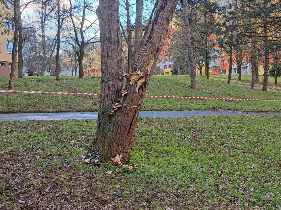 Právě teď probíhá zásah hasičů a technických služeb v ulici Lidická za blokem 607. Noční silný vítr tam poškodil jeden ze stromů, který je prasklý a hrozí jeho pád. Dojde tak zřejmě k jeho kácení. Místo je z důvodu bezpečnosti veřejnosti uzavřeno. Foto: Statutární město Most.