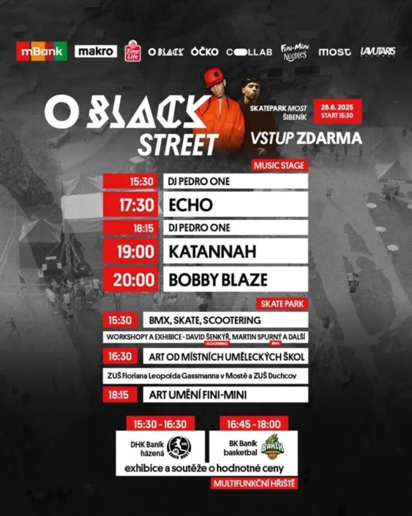 O Black Street ale není jen o hudbě – jeho hlavním kouzlem je propojení více složek pouliční kultury. Odpoledne nabídne exhibice a workshopy v BMX, skateboardingu a scooteringu. Do Mostu dorazí známí jezdci jako David Šenkýř, Martin Spurný a Honza Navrátil, kteří se postarají o pořádnou dávku adrenalinu.