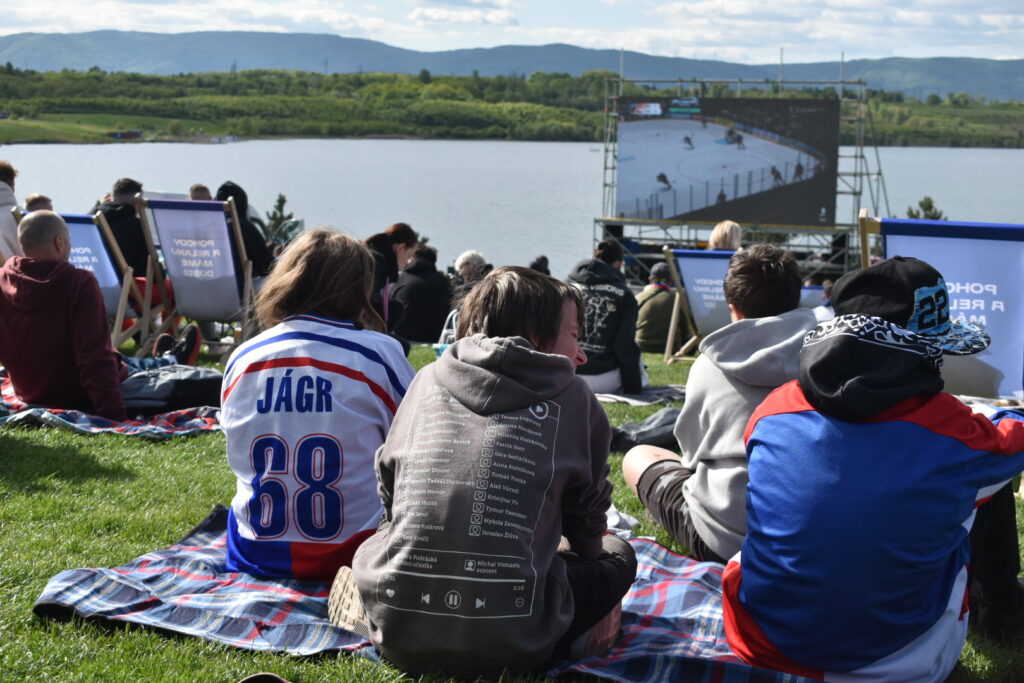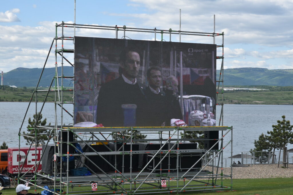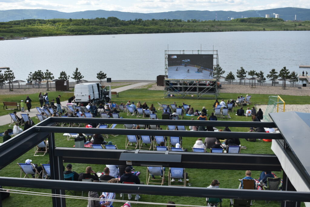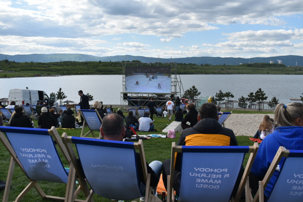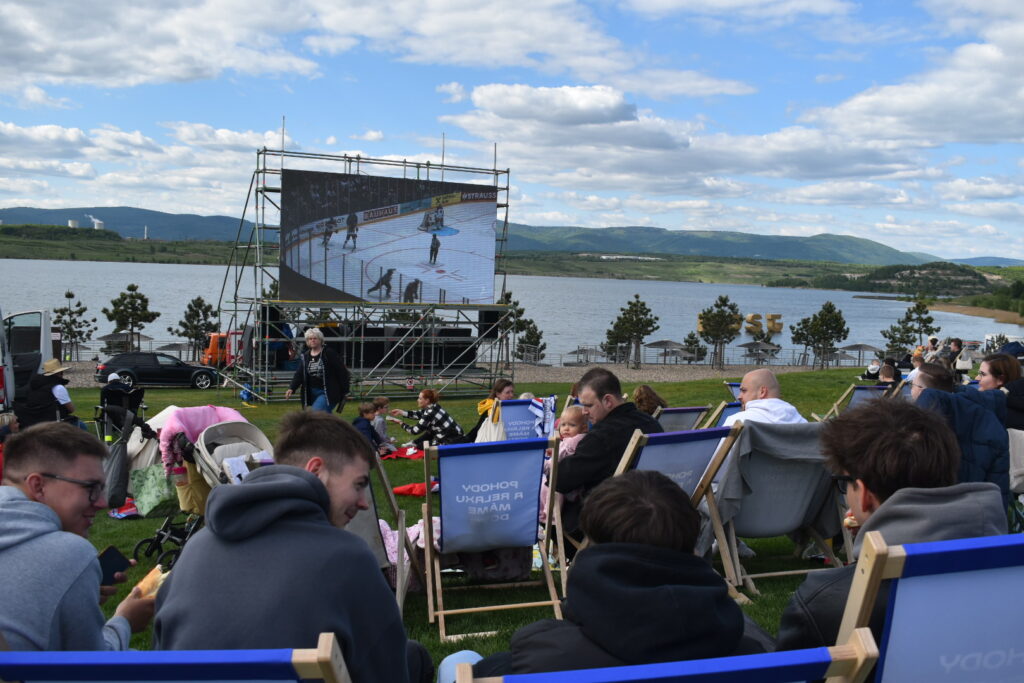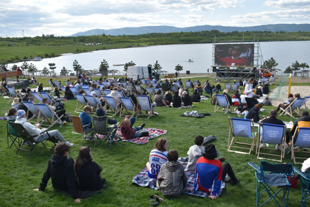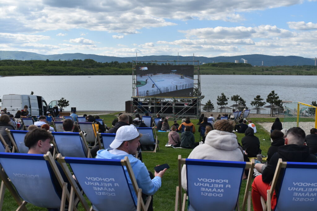 U jezera Most to dnes žije hokejem. Stovky fanoušků sledují světový šampionát pod širým nebem v zápase české hokejové reprezentace, která na úvod měří síly se silným Švýcarskem. Plné je i přilehlé parkoviště u jezera. Velkoplošná obrazovka, pohodlné zázemí, slunečné počasí a chutné občerstvení dělají z fandění zážitek pro celou rodinu.