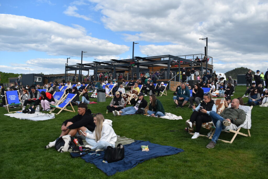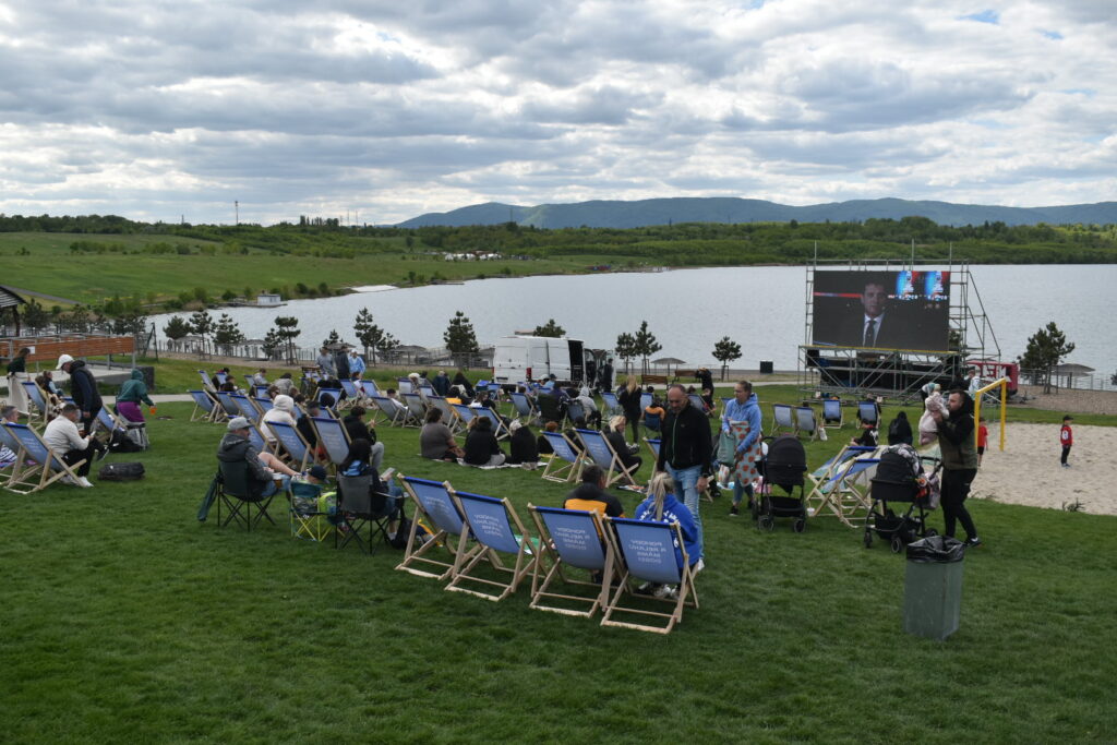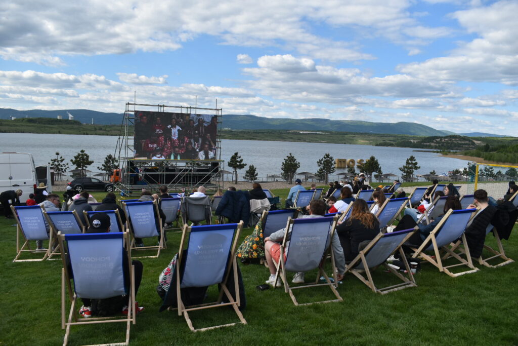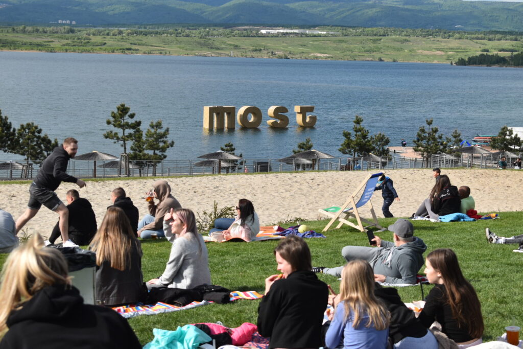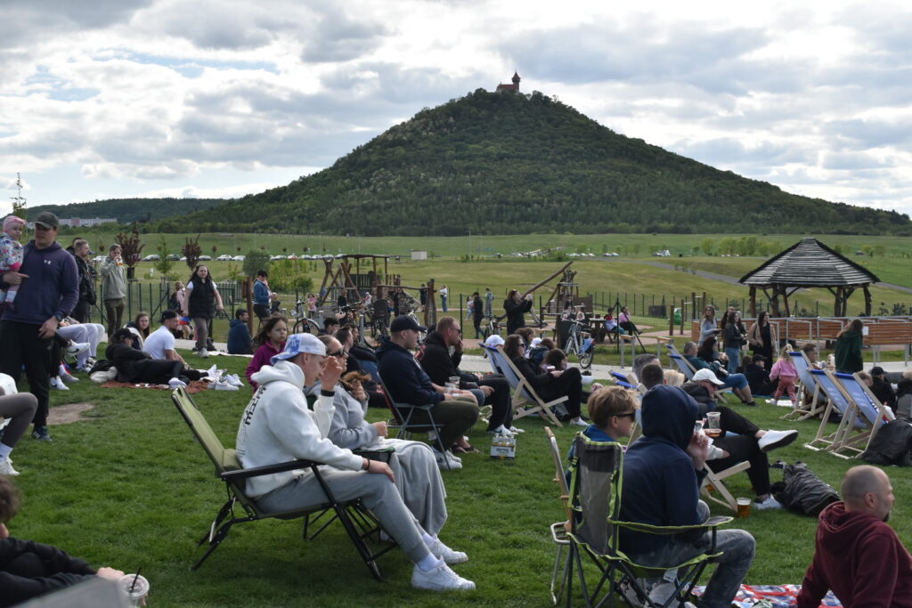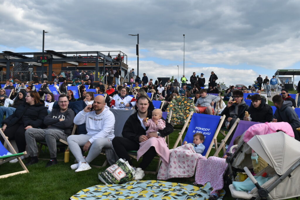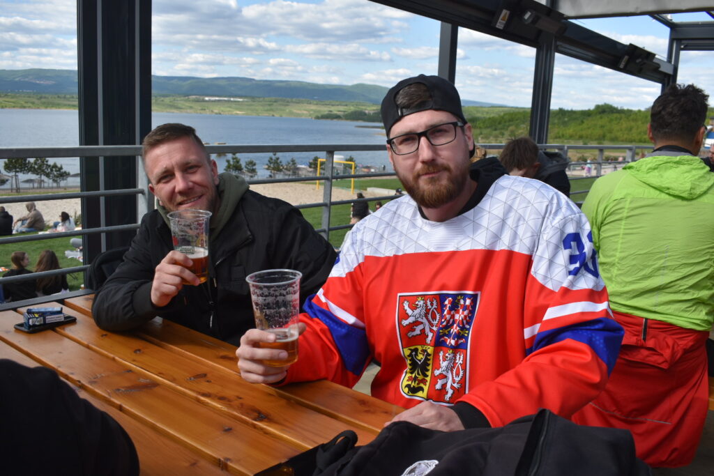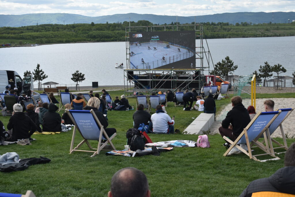 U jezera Most to dnes žije hokejem. Stovky fanoušků sledují světový šampionát pod širým nebem v zápase české hokejové reprezentace, která na úvod měří síly se silným Švýcarskem. Plné je i přilehlé parkoviště u jezera. Velkoplošná obrazovka, pohodlné zázemí, slunečné počasí a chutné občerstvení dělají z fandění zážitek pro celou rodinu.