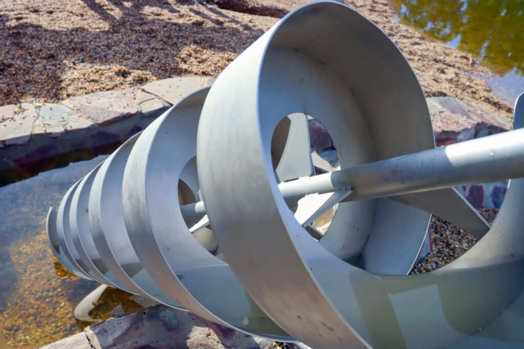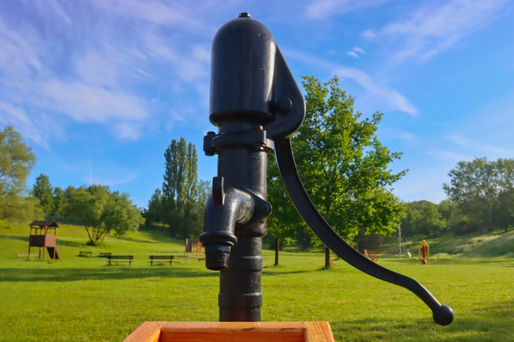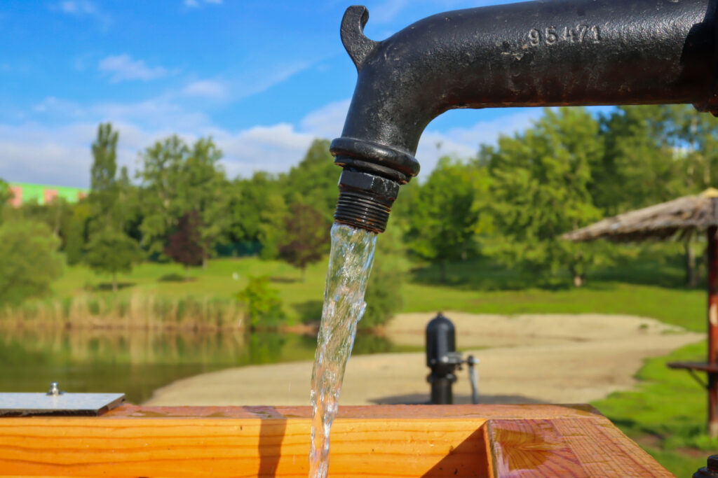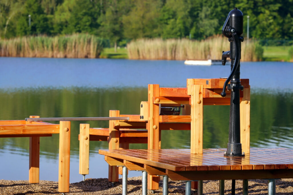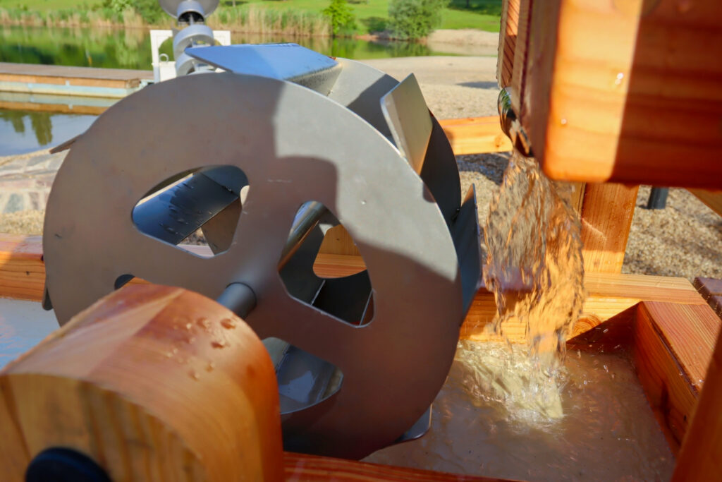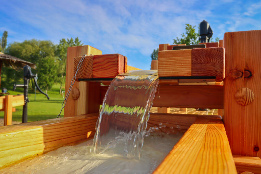 První částí je vodní systém, jehož srdcem je Archimédův šroub, jedno z nejstarších čerpadel, které je stále ceněno pro svou jednoduchost a spolehlivost. Dále je zde ruční pumpa, dřevěné nátokové koryto, umělé jezírko z obkladového kamene a fontána. Děti mohou pomocí ruční pumpy napumpovat vodu z Benediktu do korýtka, které ji vede do jezírka. Jakmile je jezírko plné, voda přetéká zpět do Benediktu. Děti se mohou také seznámit s principem Archimédova šroubu, kdy otáčením kolem vodu vytlačují vzhůru do zásobníku, odkud poté může vytékat fontánka.