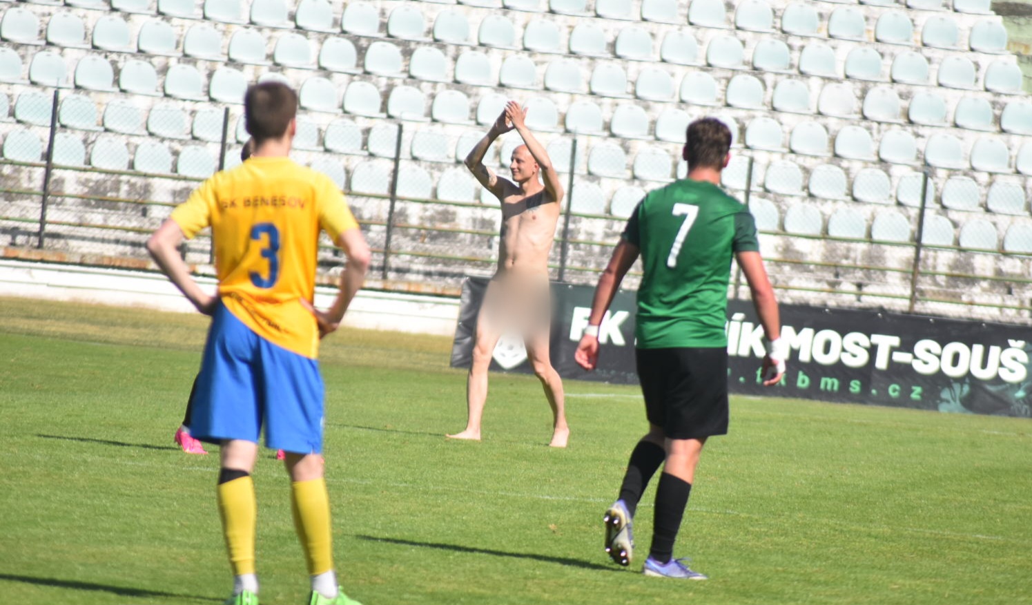 Při aktuálně hraném fotbalovém utkání ČFL mezi Mostem a Benešovem běhl na fotbalové hřiště při vstřelení druhé branky Mostu nahý muž, který na pár minut přerušil utkání. Pořadatelé se ho snažili dostat ze hřiště, muž jim ale utíkal a dokonce se napil z domácího brankáře pití. Než opustil hřiště a odebral se do hlediště, ještě si plácl s hráči.