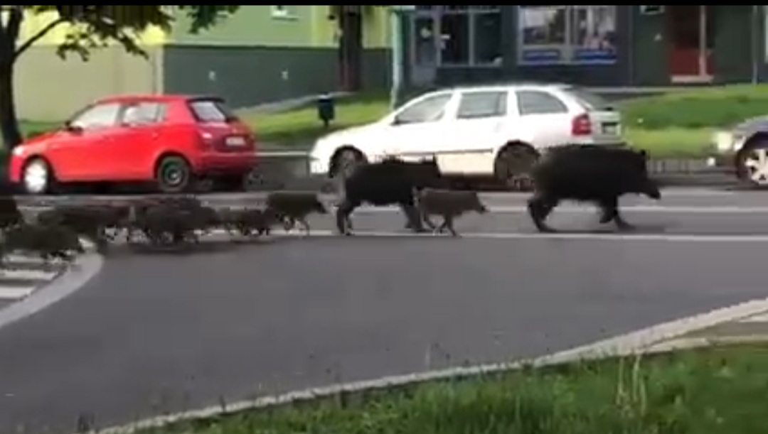 V mosteckých ulicích dnes pobíhalo několik divokých prasat, která zřejmě zabloudila a neví cestu zpět do lesa. Na videu je vidět jak se bachyně vydává přes silnici v ulici Josefa Skupy, za ní běží několik selat a za nimi vše hlídá