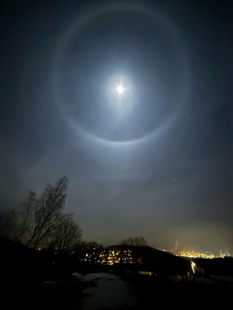 Obyvatelé Mostu, Litvínova a širokého okolí mohli v neděli večer obdivovat vzácný přírodní úkaz – kolem Měsíce se vytvořil obrovský bílý kruh, známý jako měsíční halo. Tento optický jev v atmosféře vzniká lomem měsíčního světla na drobných ledových krystalcích, které se nacházejí ve vysoké oblačnosti přibližně deset kilometrů nad zemským povrchem.